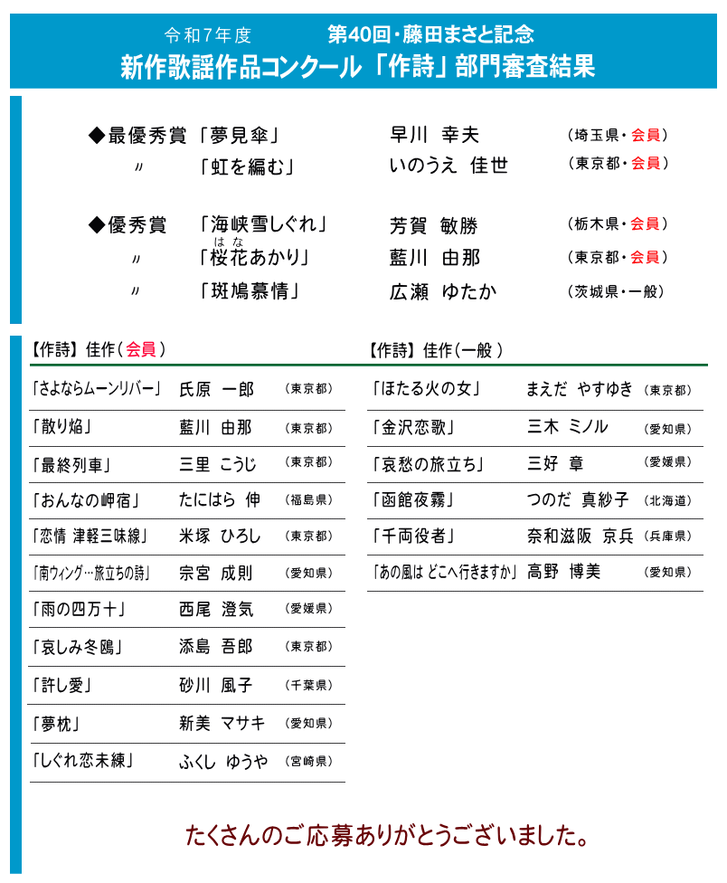 | --令和7年度 第40回 新作歌謡作品コンクール『作詩』入賞作品-- |