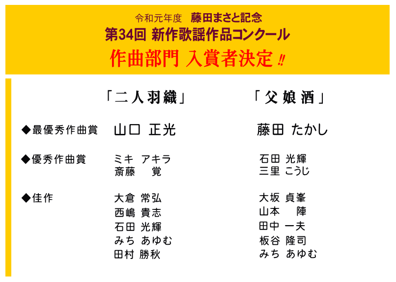 | --令和元年度 第34回 新作歌謡作品コンクール『作曲』入賞作品-- |